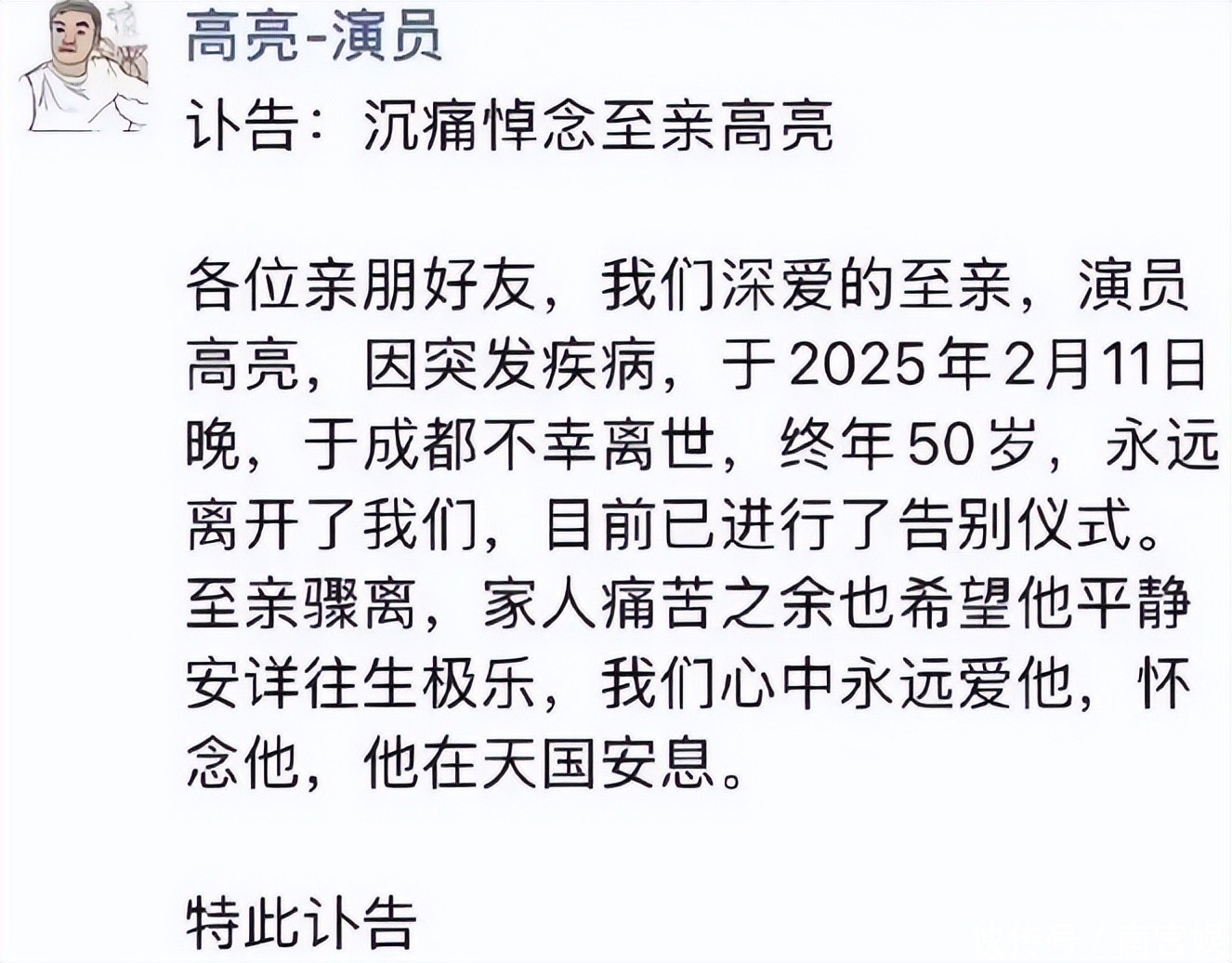 发文中所指的“亮哥”去世的消息,已经得到其家人的证实,并在讣告中写到,高亮是在2025年2月11日因突发疾病离开人世。